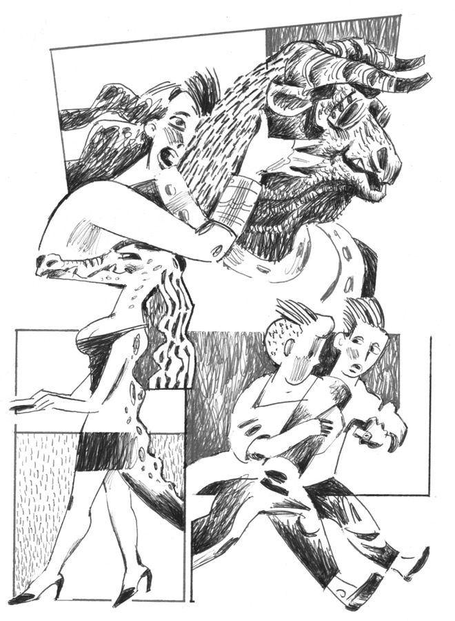 Она сорвала с себя одежду и превратилась в огромного крокодила с головой прекрасной женщины. Подскочила к Минотавру и закружила его в танце.