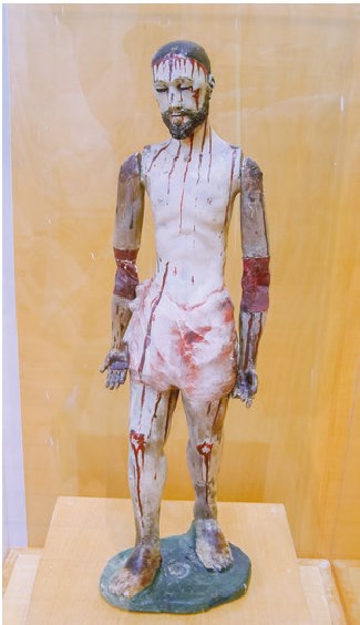 Возле входа стояли три стеклянных короба с куклами, изображавшими католических святых. Эти святые были в простой одежде без украшений. Кисти рук у них были отрублены. Рядом на полу стояли колокола. Стена из горящих свечей огораживала безрукие фигуры и колокола.