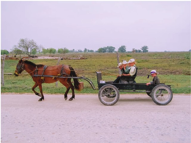 По обе стороны дороги открывались картины Дикого Запада: одноэтажные деревянные дома с верёвочными качелями у крыльца, ветряки во дворах. Навстречу мне проезжали конные брички, которыми управляли фермеры в широкополых соломенных шляпах и штанах с подтяжками. В бричках сидели женщины в старомодных платьях.