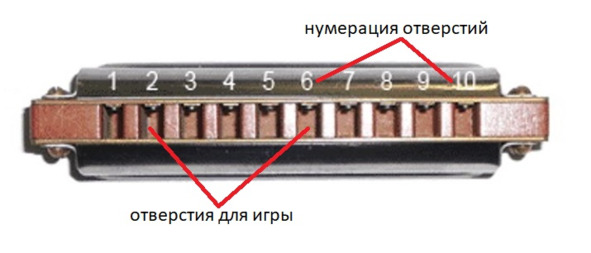 На рис.1.2 видны игровые отверстия с нумерацией, через которые проходит воздушный поток (на вдох или выдох), создаваемый музыкантом во время игры на Губной Гармошке.