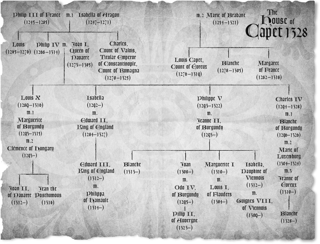 The Queen: JEANNE OF NAVARRE, daughter of Louis the Hutin and Marguerite of Burgundy, granddaughter of Philip the Fair, heiress to the Kingdom of Navarre, aged 17.