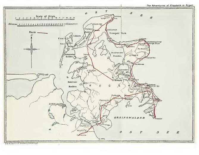 This seemed to me very irresistible. Surely a place that inspired such a mingling of the lofty and the homely in its guide-books must be well worth seeing? There was a drought just then going on at home. My eyes were hot with watching a garden parch browner day by day beneath a sky of brass. I felt that it only needed a little energy, and in a few hours I too might be floating among those jelly-fish, in the shadow of the cliffs of the legend-surrounded island. And even better than being surrounded by legends those breathless days would it be to have the sea all round me. Such a sea too! Did I not know it? Did I not know its singular limpidity? The divineness of its blue where it was deep, the clearness of its green where it was shallow, lying tideless along its amber shores? The very words made me thirsty—amber shores; lazy waves lapping them slowly; vast spaces for the eye to wander over; rocks, and seaweed, and cool, gorgeous jelly-fish. The very map at the beginning of the guide-book made me thirsty, the land was so succulently green, the sea all round so bland a blue. And what a fascinating island it is on the map—an island of twists and curves and inland seas called Bodden; of lakes, and woods, and frequent ferries; with lesser islands dotted about its coasts; with bays innumerable stretching their arms out into the water; and with one huge forest, evidently magnificent, running nearly the whole length of the east coast, following its curves, dipping down to the sea in places, and in others climbing up chalk cliffs to crown them with the peculiar splendour of beeches.