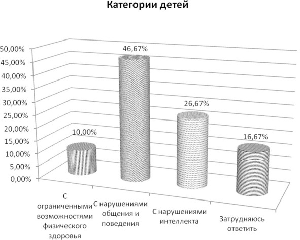 – Дети имеющие нарушения общения и поведения. Большинство респондентов (46,67%) отметили данную котегорию детей как самую трудную при совместном обучении.