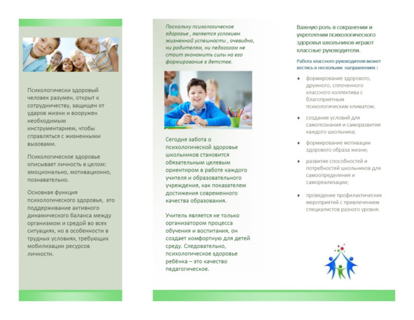 Забота о психологическом здоровье школьников важна и необходима для их развития. Главный вывод статьи заключается в том, что необходимо осведомлять родителей, учителей, классных руководителей о важности профилактики психологического здоровья детей и подростков. С этой целью нами были составлены рекомендации для классных руководителей в виде буклетов. Подчеркиваем, психологическое здоровье школьника – это качество педагогическое (рис. 3).