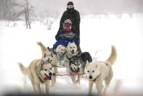 Подъехали ребята, с которыми нам предстояло освоить езду на нартах. Они с маленькими детьми, и нас это не остановило. У гостеприимных хозяев нашлась для всех дополнительная одежда, маски, одеяла и шкуры. Владимир объяснил, как управлять санями, мы выехали на трассу.