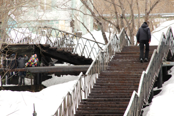 Город расположен на сопках, много лестниц, повсюду теплотрассы, на которых стайками собираются подростки.