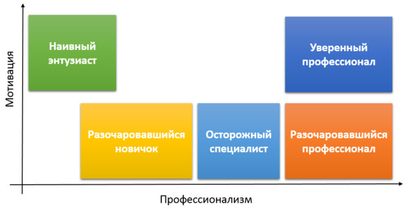 Правда не всем удается долго удерживаться на гребне волны успеха. Что-то всегда может пойти не так в этом непредсказуемом мире. Он меняется с пугающей скоростью. Тема, в которой вы стали признанным экспертом, вышла из моды и больше не пользуется спросом. На арене появился более молодой и проворный конкурент, который оказался интереснее публике. Бог знает, что еще может произойти. В результате часть «уверенных профессионалов» покидает их уверенность, и они возвращаются на стадию, похожую по симптомам на состояние «осторожный специалист». Назовем ее «разочаровавшийся профессионал» (рисунок №4).