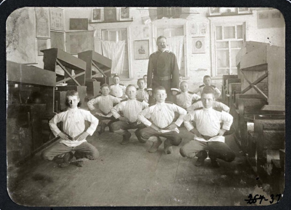 «Школа от нашего дома была сравнительно недалеко, на церковной площади. Одноэтажное, обширное здание, имеющее пять классных комнат и другие вспомогательные помещения. Имелся просторный пришкольный игровой двор, на котором были сооружены различные спортивные снаряды – всевозможные лестницы с различными уклонами и предназначениями, турники, качели и многое другое… Физкультура в школе целиком строилась приближённой к строевым казачьим воинским перестроениям. Вёл эти занятия гимнастикой, как их называли тогда, специальный штатный военный учитель, «господин урядник». Жил он рядом со школой, и к тому времени, когда в школе заканчивались уроки грамоты, приходил, одетый в форму казачьего урядника, в погонах с тремя лычками. Он обладал завидной строевой казачьей выправкой. Учил нас всему тому военному, что впоследствии требовалось казаку, призванному уже на действительную военную службу. Вот почему и приучали казаков к военной службе с самого раннего детства, что называется – начиная со школьной скамьи…