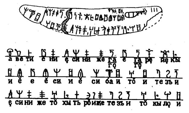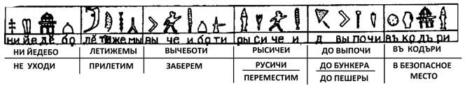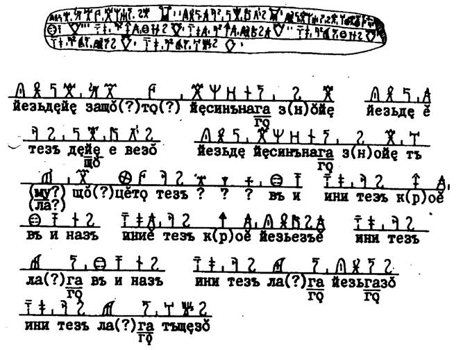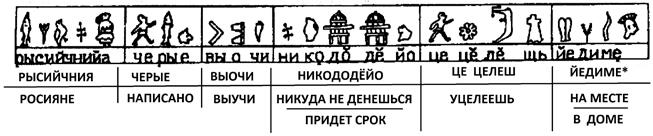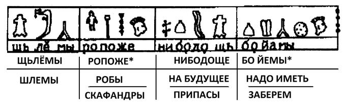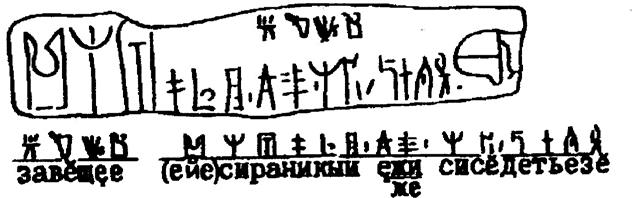 Вторым переводом, требующим уточнения, является входящая в состав таблички д) формулировка «СИСЕДЕТЬЕЗЕ», переведённая мной как «СЕСТЬ СПОДОБИТСЯ» (буквально «СЕСТЬ ПОДОБНО»). Однако термин «СИСЕДЕ» представляет собой глагол уйти/покинуть место. Так, на микрожинском камне читаем: «НО НАШИ СОСЕЛИ» (покинули место). Поэтому завещанный летательный аппарат мог предназначаться для эвакуации в случае опасности. Тогда желание или нежелание сесть в него не имеет значения.