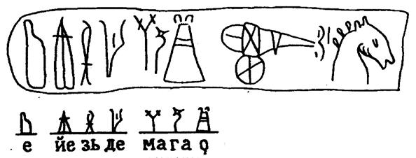 В верхней строке написано: ЗАВЕЩАЮ, в нижней ЕЙЁ (ей/её) СИРАНИКИИ ЕЖЕ (ли) СЕСТЬ СПОДОБИТСЯ. На обломанной части таблички видна кабина летательного аппарата. Она хорошо узнаваема. А вот так завещанный аппарат выглядит целиком.