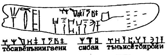 Две из приведённых надписей в) и д), на мой взгляд, нуждаются в дополнительном объяснении. В надписи в) словосочетание «СИВЁНЬНИИГАЕНИ» я представил в значении «СЕВЕРНЫЕ ГОНЦЫ» (посланники), т. е. прилетавшие с севера. Однако это значение мне не кажется единственно верным, так как слово «СИВЁНЬНИИ» может иметь значение ЛУННЫЕ от «СИВЕНЬ» (Луна/СЕ ВЕНЬ) Спутник.