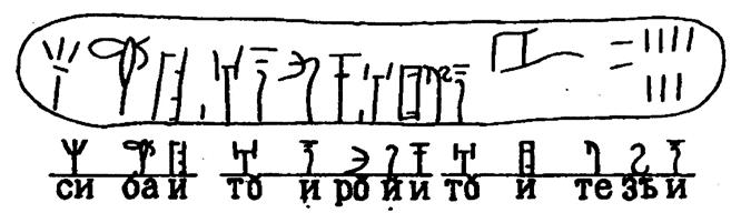 Крайне интересна следующая надпись, представляющая собой учётную ведомость. Здесь написано: «ТЕЗЬСИЙЕЗЬИ» (далее идёт знак ДЕТИ, затем число 7, затем АРАИАВЕ и число 6. Здесь сказано: Подобных СИЙЕЗЬИ (правильных) подлежащих отправке мальчиков – 7 шт., АРАЙИ (здоровых/способных к репродукции) девочек – 6 шт.