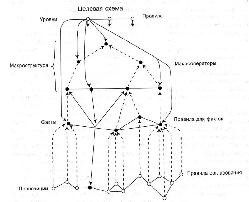 Предполагается, что обработка текста происходит на нескольких горизонтально показанных уровнях, обозначенных на рисунке слева, справа – применяемые к ним операции. Нижний из них – это сам текст, представленный в виде пропозиций; затем располагается описываемый в тексте уровень фактов; следующий уровень – макроструктуры текста, на вершине расположен уровень целевой схемы. На первом уровне обработки происходит трансформация текста в ряд пропозиций. Это делается для того, чтобы выявить семантические отношения слов и «отсечь» грамматическую форму. Пропозиции имеют структуру: предикат-субъект-объект (например, «открыла – Кюри – радий»). На основе пропозициональной формы текстового материала с помощью определяемых в модели операций строится семантическая сеть, отражающая отношения между пропозициями. В сетях показаны причинные, временные, пространственные отношения между объектами. Сети оказываются все более сложными по мере того, как анализируемый текст наращивает сложность описываемых отношений. В результате объем информации превосходит возможности оперативной памяти. При этом включается целевая схема, которая в соответствии с заданными «ожиданиями» и при включении долговременной памяти производит отбор наиболее релевантной информации и формирует структуру «конденсата» информации – как бы заключительную репрезентацию «смысла» анализируемого текста.
