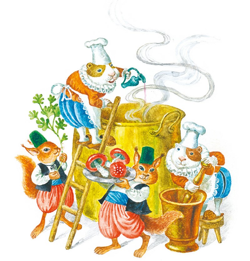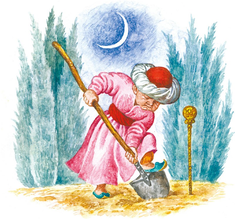 – Маленький Мук, ты обладаешь чудесными вещами, и я расскажу тебе, как ими пользоваться себе во благо. Если ты дважды подпрыгнешь на месте, туфли перенесут тебя куда угодно. А волшебство твоего посоха позволяет находить клады. В том месте, где закопано золото, он воткнётся в землю, а где серебро – там просто упадёт на землю.