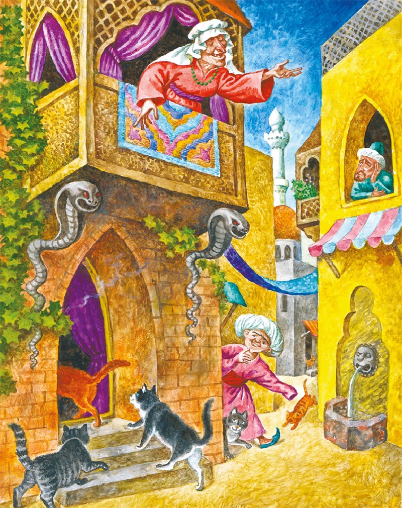 Мальчик остался жить у старухи и выполнял работу, которую она ему поручила: вычёсывал котов и кошек, намазывал им шерсть какими-то диковинными настоями, кормил всех любимцев хозяйки.