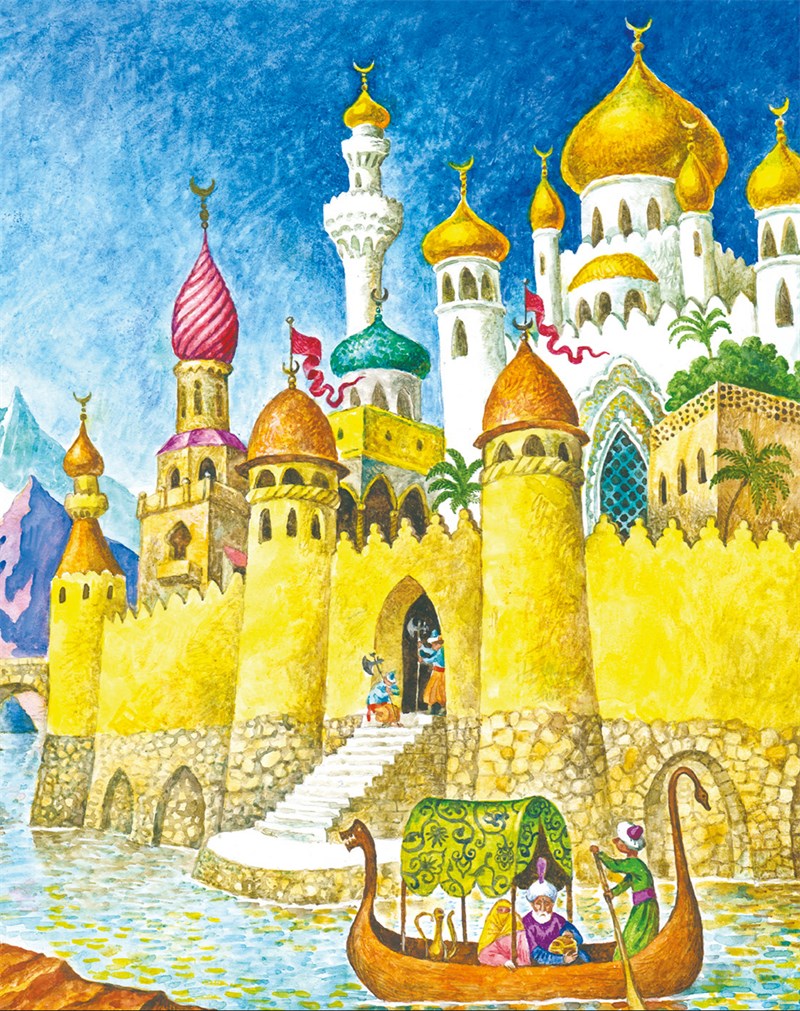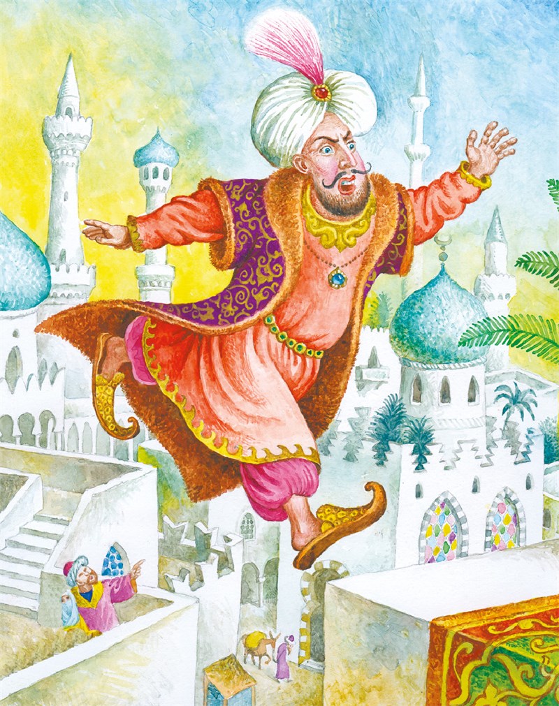 Через несколько дней Мук вышел к незнакомому городу. Издалека мальчик осмотрел его, и ему понравилось то, что увидел: цветные крыши домов, флаги на башнях и залитые солнцем улицы.