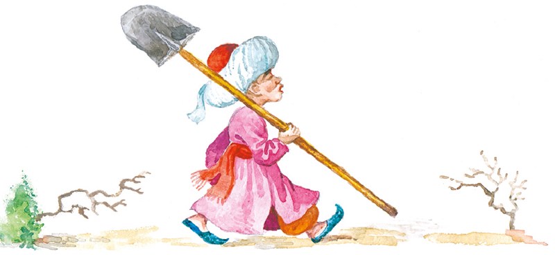 Градоправитель приказал зарыть несколько золотых монет в саду, после чего туда привели Маленького Мука и приказали ему найти монеты.