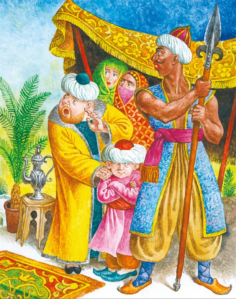 Маленький Мук вышел в центр площади, увидел градоправителя с женой и детьми, которые восседали на почётных местах, и вежливо им поклонился. Зрители, увидев мальчика, восторженно закричали: здесь раньше никогда такого потешного карлика не видели: большая голова в ещё большем тюрбане, хилое тельце, закутанное в старый халат, на поясе кинжал, едва ли не больше мальчика, а на ногах огромные туфли. Всё это вместе выглядело так комично, что горожане, собравшиеся на площади как один расхохотались.