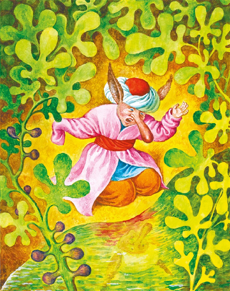 Тут он начал понимать, что с ним произошло: плоды первого дерева наградили его ослиными ушами и огромным носом, другое же дерево вернуло ему нормальный облик.
