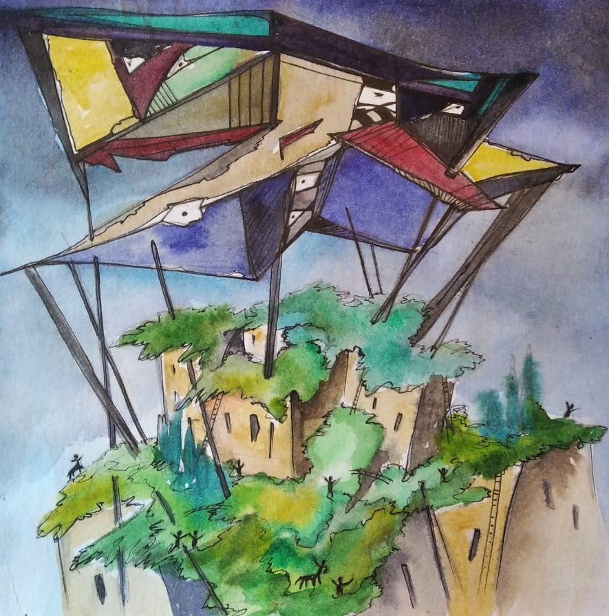 И тут надземные увидели… По стенам домов, на которых стоял Оазис, карабкались и вылезали на крыши Серые. Угловатые и длиннохвостые, они медленно шли к Оазису. А сверху, над витавшим, как обычно, в облаках Рыцарем опускалась огромная тень – это был сам Тепобрус Паноптис.