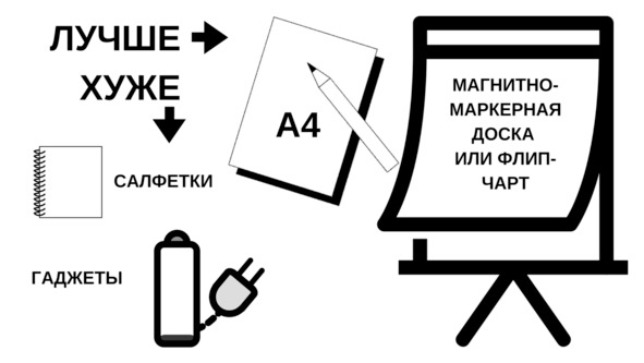 В наилучшем случае в кабинете коуча должна быть хотя бы небольшая магнитно-маркерная доска. Результаты исследований и практик клиент и коуч (при необходимости) могут сфотографировать, сохранив себе в каких-либо целях.