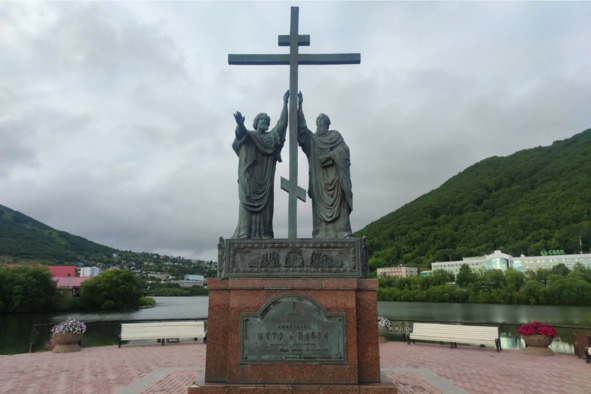 В завершение скромной обзорной прогулки, щедро презентованной нам Анной, мы немного прогулялись по Озерновской косе, где в тот вечер у стелы «Город воинской славы» проводилось открытие молодежного экологического форума «Экосистема. Заповедный край», а также добрались до памятника-часовни, где «». «». Воздав должное защитникам города, отстоявшим его в неравной схватке с неприятельской эскадрой в составе шести кораблей, и милосердию благодарных жителей, создавших этот монумент, мы поспешили обратно, теперь уже с твердым намерением вернуться в свое временное прибежище, дабы наконец-то отдохнуть и набраться сил перед предстоящей на следующий день вылазкой. на перешейке между Петровой и Никольской горами, у подножия последней, круто возвышающейся над Авачинской бухтой, покоится прах воинов в виде двух могильных курганов В правой погребены русские воины, в левой – англичане и французы, тела которых были подобраны после заключительного сражения… <…> … при отражении англо-французского десанта 24 августа 1854 г. 16 17