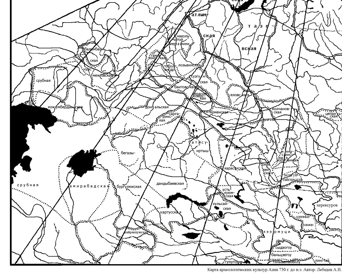 Минусинская котловина. В Минусинской котловине в то время проживало население, оставившее Минусинскую курганную культуру93. Население данной культуры своих покойников хоронил под курганами, где, порой, размещалось по несколько могил. Ориентировка покойников в погребениях – в вытянутом положении головой в северо-восточном направлении. Если судить по позе покойника в захоронениях и их ориентации в пространстве, то это население следует признать родственным населению дворцовской культуры.