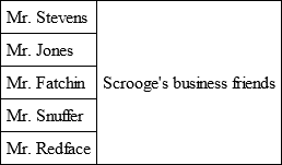 Scrooge. First dress: Brown Quaker-cut coat, waistcoat and pants. Dark overcoat. Low-crowned, broad-brimmed hat. Black silk stock and standing collar. Bald wig with tufts of white hair on each side. Smooth face. Second dress: Dressing gown, cotton night-cap and slippers.
