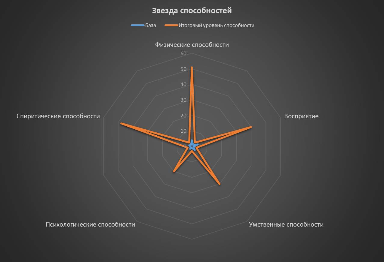 Основные характеристики: физические способности – 50-й уровень; восприятие – 35-й уровень; умственные способности – 37-й уровень; психологические способности –27-й уровень; спиритические способности – 20-й уровень.