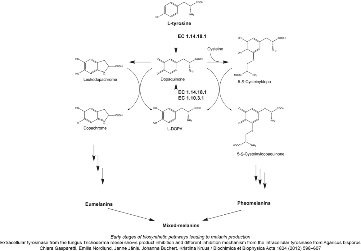 Эумеланины – это чёрные и коричневые азотистые пигменты, которые возникают при окислительной полимеризации 5,6-дигидроксииндолов, полученных из тирозина через допахинон. Исходной производства эумеланина в меланоците является тирозин, который находится либо в виде свободной аминокислоты, либо в сочетании полипептидной цепи. Эумеланины полностью поглощают световые лучи, давая чёрную пигментацию. Мутагенной (мутированной) формой эумеланина являются сферические коричневые и коричные пигменты. Эумеланины практически нерастворимы в воде и в органических растворителях. Они чрезвычайно инертны, стабильны и подвергаются изменениям лишь в результате наиболее жёстких химических воздействий. Вместе с тем эумеланины могут обесцвечиваться при длительном выдерживании на воздухе на ярком солнечном свету или, особенно эффективно, при продолжительном окислении перекисью водорода.