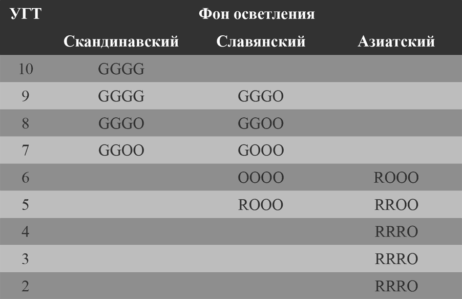 В волосах славянского типа в основном преобладает оранжевый тип феомеланина, поэтому после осветления или обесцвечивания мы с вами видим ярко выраженный оранжевый фон осветления. Натуральный уровень глубины тона такого типа волос колеблется от 9 до 5. Поэтому для нейтрализации данного типа феомеланина вам понадобится в работе синий цвет нейтрализаторов. При работе с 5 УГТ вам придётся добавлять сине-зелёный к синему, а при работе с очень светлыми 8–9 базами иногда требоваться будет добавление фиолетового микстона.
