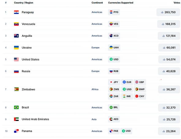 Интересно! Опрос ресурса CoinMarketCap показывает, что участники криптосообщества ждут легализации биткоина в качестве законного средства платежа в ряде других стран. Первыми на очереди, по мнению пользователей сети, могут быть Парагвай, Венесуэла, Ангилья, Украина, США и Россия3.