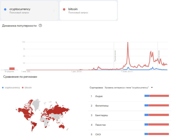 Пик популярности биткоина, по данным Google Trends, пришелся на декабрь 2017 года. В этот период криптовалюта обновила максимум близ уровня $20 000. Следующая вспышка интереса пользователей сети к BTC зафиксирована в феврале 2021 года на фоне активного роста курса монеты. Количество поисковых запросов по слову «криптовалюта», как показывает история, также растет в периоды позитивной динамики биткоина.