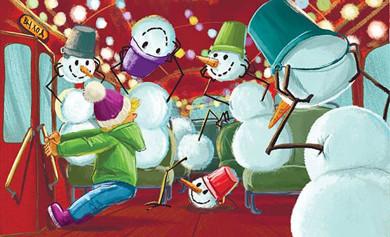 Автобус внутри был точно бархатом красным оббит. А по бархату гирлянды лампочек разноцветных прикручены, и все они горят и мигают так, что и в глазах, и в голове у Стёпика всё замигало. На месте водителя нет никакой приставки, а сидит там важный толстый снеговик с нарисованной улыбкой на глупом круглом лице. Смотрит он глазами-угольками своими на Стёпика и рукой-веткой ведро с головой вместе снимает, будто здоровается. А на пассажирских местах тоже снеговики сидят, только поменьше и все свои вёдра с головами-шарами снимают и Стёпику кланяются церемонно, как неваляшки. Что-то совсем мальчику не до приставки стало. Стал он ручку автобусной двери дёргать, а она не открывается. Только слышит он, что вроде как задняя дверь автобуса со стонами да скрипами приоткрылась, и бегом-бегом туда через салон, а снеговики руками ветками к нему тянутся, норовят схватить, словно через густые жёсткие кусты он бежит. Ещё и музыка какая-то зловещая в салоне включилась и дребезжит в ушах пугающе.