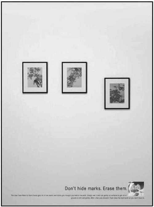 Теперь взгляните на следующее рекламное объявление (рис. 4). Ситуация идентичная, правда? Заведомая несимметричность одной из картин не может не привлечь наше внимание. Этим знанием и воспользовались рекламисты для продвижения средства, которое превосходно борется с загрязнениями на любых поверхностях. Девиз кампании: «Не прячьте пятна. Удалите их».