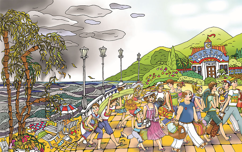 А теперь побережье стало мрачным и унылым. Цветы повяли, печально свесив свои головки, листья с деревьев опадали один за другим, будто наступила поздняя осень.