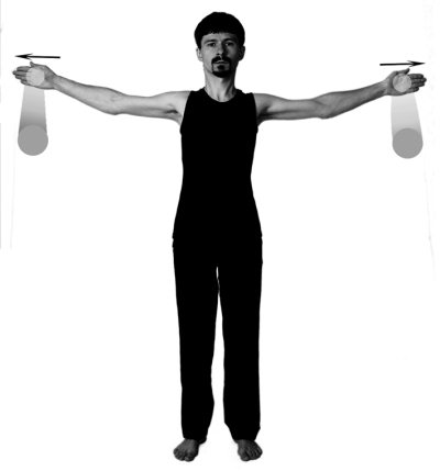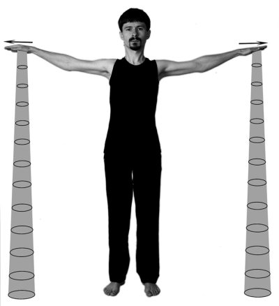 Выпрямите Тело. Вытянитесь. Разведите руки в стороны ладонями вниз. Тянитесь изо всех сил пальцами, не напрягая мышц шеи и предплечий. Продержите какое-то время руки в таком положении, затем разверните ладонями вперёд. Внимательно прислушайтесь к ощущениям. Что изменилось после того, как вы направили ладони вперёд?