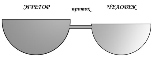 Из источника (человека) во время чувственных вспышек и умственных выводов переливается живая жидкость мысли в сопряжённый сосуд. Если проток между сосудами достаточно расширяется (растёт привязка человека к данному виду самовыражения), то его поток внезапно встречает давление наполненного эгрегора.