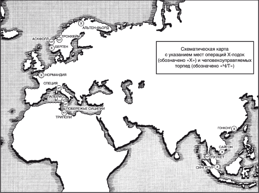Британский военно-морской флот не мог не понимать этой ситуации и уже готовил карликовые подводные лодки серии «X», с командой в три-четыре человека[4]. Развертывание этого вида оружия оказалось долгим делом, так что, когда меморандум премьер-министра с опозданием дошел до сэра Макса Хортона[5], в то время командующего подводными лодками, необходимость немедленного создания ударной группы подводных лодок стала очевидной. Британские человекоуправляемые торпеды, планировавшиеся как временное оружие, стали, соответственно, долгожданной заменой ожидаемых карликовых подводных лодок.