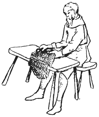 Рис. 4. Изготовление кольчуги. С помощью взятого в правую руку инструмента ремесленник автоматически вставляет в отверстия заклепки и расплющивает их, соединяя кольца.
