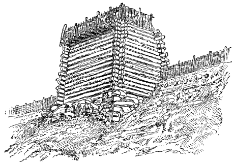 Сигильд окружил лагерь чередой деревянных башен, размещенных на старой крепостной стене, которая была укреплена. Эти башни, внешний вид которых показан на рис. 6, были построены из стволов деревьев, уложенных друг на друга в сруб.