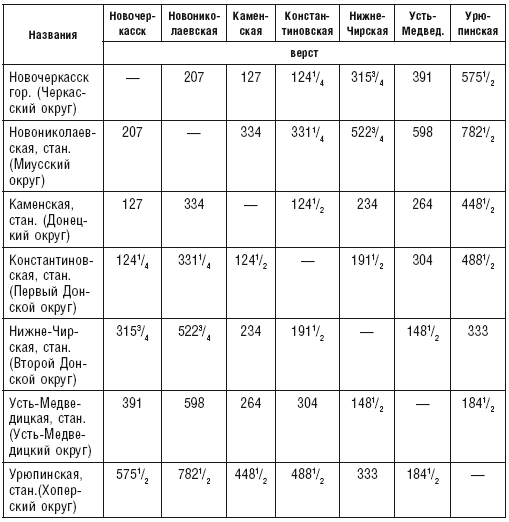 Территория войска Донского в середине XIX – начале XX в. имела большое значение в общей системе сухопутных сообщений имперской России. Через нее пролегал главнейший путь из Москвы на Кавказ, через нее осуществлялись торговые коммуникации с Одессой и другими южными портами России. Однако состояние путей сообщения на Дону оставляло желать лучшего на протяжении всего рассматриваемого нами периода. В описании середины XIX в. донские дороги выглядели следующим образом: «Почти все дороги зимой (в январе и частью в феврале) и в сухое время остального года (с апреля нередко по ноябрь) представляют сеть превосходных сообщений, удобством не уступающих шоссе; но после 2–3 ненастных дней все изменяется: почва обращается в грязь, бегущие ручьи, играющие балки сносят ветхие мосты, лощины и места низменные наполняются водой. Порче дорог еще содействуют чумацкие обозы26, которые и в хороший зимний путь покрывают дороги выбоинами и ямами»27. Ямщичий промысел на Дону развит не был, правильно устроенных дорог – шоссе – казаки не имели. Н.И. Краснов в начале 1860-х гг. давал такие рекомендации путешествующим по донской земле: «Проезжающий должен запасаться всем необходимым, потому что на станции кроме самовара он ничего не найдет, даже вода большею частью дурного качества»28. Советы Краснова действительно были не лишними, так как время, потраченное на преодоление расстояний между потенциальными пунктами прибытия-отбытия, было весьма значительным. От Санкт-Петербурга казачью столицу Новочеркасск отдаляли 1714 верст, от Москвы – 1041 верста (по расчетам того времени), или около 1829 км и 1111 км соответственно29. До постройки сети железных дорог, для того чтобы добраться из Новочеркасска до Москвы, требовалось около 140 часов (почти 6 суток) хорошей езды на почтовых лошадях30, то есть средняя скорость путешествующего составляла около 8 км в час. О расстоянии между окружными станицами войска Донского можно судить по следующей таблице, взятой из «Дорожника Области войска Донского» за 1877 г.31