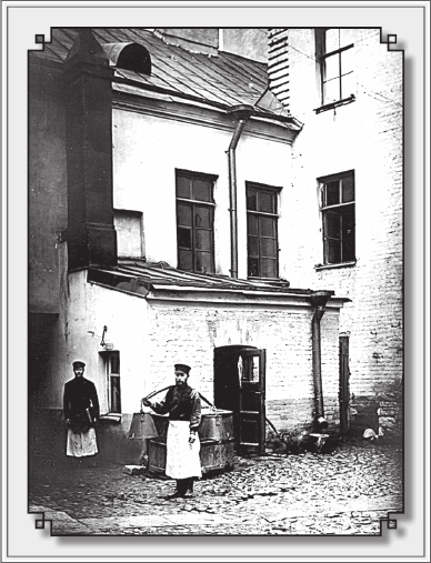 Вот и на снимке дворник – с ведрами. Припозднившегося жильца впустить, ворота ему открыть… Мало того, каждый дворник, согласно графику, составленному в полицейской части, обязан был нести еще и ночное дежурство: «на ногах», как требовала инструкция, лишь изредка присаживаясь для отдыха «на табурет без спинки».