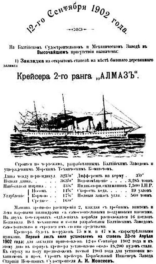 12 сентября 1902 года на Балтийском судостроительном заводе в высочайшем присутствии торжественно провели спуск на воду эскадренного броненосца «Князь Суворов» и закладку крейсера 2-го ранга «Алмаз». К 11 часам утра там собрались сотрудники управлений Морского министерства: генерал-адъютант П. П. Тыртов, начальник Главного Морского штаба, вице-адмирал Ф. К. Авелан и другие морские чины. В 11 часов на завод прибыла королева эллинов Ольга Константиновна с королевичем Христофором. Королеве при встрече преподнесли роскошный букет цветов. В 11 часов 10 минут на яхте «Александрия» прибыл из Петергофа под своим брейд-вымпелом Николай II. После торжественного спуска на воду эскадренного броненосца «Князь Суворов» император совершил церемонию закладки крейсера «Алмаз» на открытом стапеле Балтийского завода. Приняв закладную серебряную доску, Николай II изволил собственноручно окрасить суриком специальное гнездо, заложить в него своеобразный паспорт крейсера и даже символически расклепать одну из четырех раскаленных заклепок, соединяющих крышку с корпусом закладной ниши.