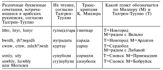 Хотя Идриси хорошо знал русские земли, его карты вызывают разочарование (рис. 5), поскольку названия на них очень трудно расшифровать из-за того, что некоторые арабские сочетания букв вызывают разночтения (табл. 2). Щеглов (1876 г.) приводит примеры написания названия «Киев» в разных арабских и персидских географических рукописях, переведенных Гаркави и Френом. Киев писался так: Кугаба, Кунаба, Куная, Курбая, Кербея, Каркаяна, Керсабе, Карбане, Кубабе, Кубате, Кюзаба, Кубазе, Кубаня, Кабае, Кутате, Кутазе, Катае, Кузате, Кузая, Куябе, Кунане, Кузасе, Кар-Акертия, Кератия, Карракартия, Капкияна, Гунатек, Курпапах и др. Более того, Френ отмечает, что каждое из этих арабских названий могло читаться 24 различными способами, и их написание у разных авторов разное. Отсюда становится ясно, что определить по этим названиям, о каких географических объектах идет речь, почти невозможно.