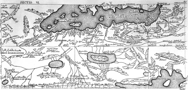 Полный текст рукописи 1154 г. был опубликован во французском переводе Яубертом (1836–1840 гг.). Листы, на которых изображены северные районы Европы, включая балтийские провинции и Россию, были детально проанализированы Талгрен-Туулио [Tallgren-Tuulio, 1930, 1936] и Б.А. Рыбаковым (1952 г.). См. также книгу Минорского (1937 г.), где приведена обширная библиография, а в комментариях переводчика содержится ряд интересных сведений. Большую ценность имеет и книга К. Миллера (1926–1931). В ней, помимо других вещей, он воспроизводит большую карту Идриси, выполненную в цвете, и идентифицирует топонимику карты с современной. Однако эти названия, особенно встречающиеся в русских землях, следует воспринимать критически.