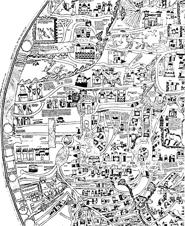 Рис. 6. На этом участке карты Эбсторфа слева видна рука Христа. Иерусалим находится справа от изображения животного в центре карты. Очень сильно уменьшена
