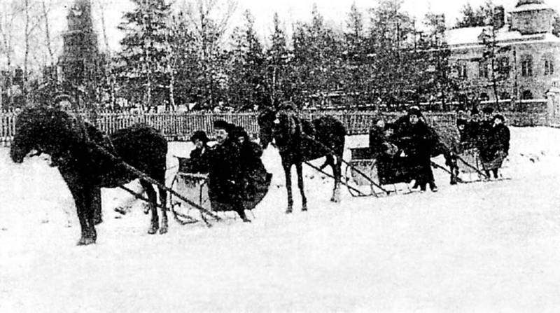 Катание на санях на территории Политехнического института в Масленицу. Фото 1914 года