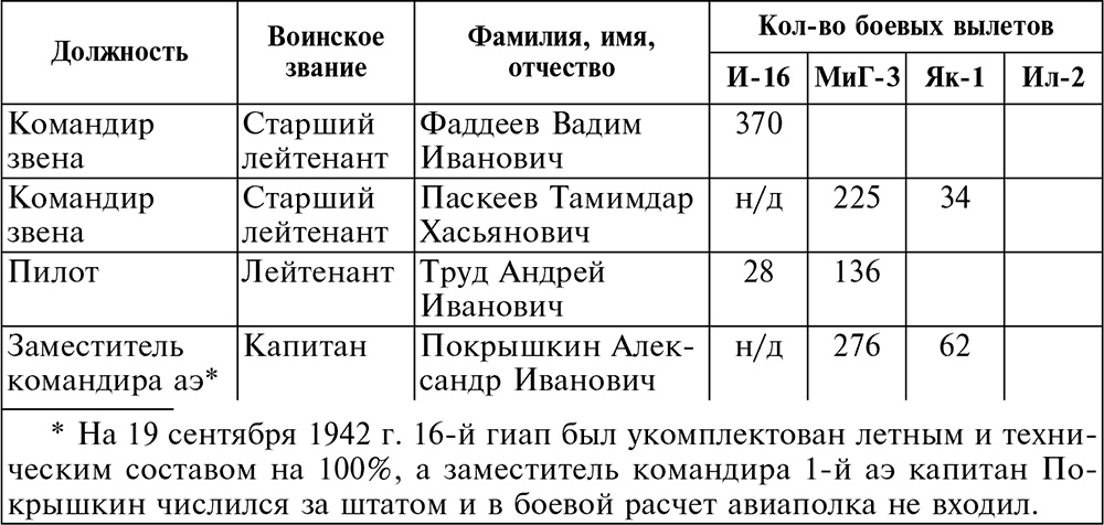 Однако эти данные не могут полноценно характеризовать боевую работу летчиков 16-го гиап на этот срок (19.09.42 г.), т. к., кроме МиГ-3, они летали на боевые задания и на других типах советских самолетов (кроме указанных в таблице еще были следующие самолеты: Р-1, И-3, И-5, И-15, И-153, У-2, УТ-2 и т. д.).