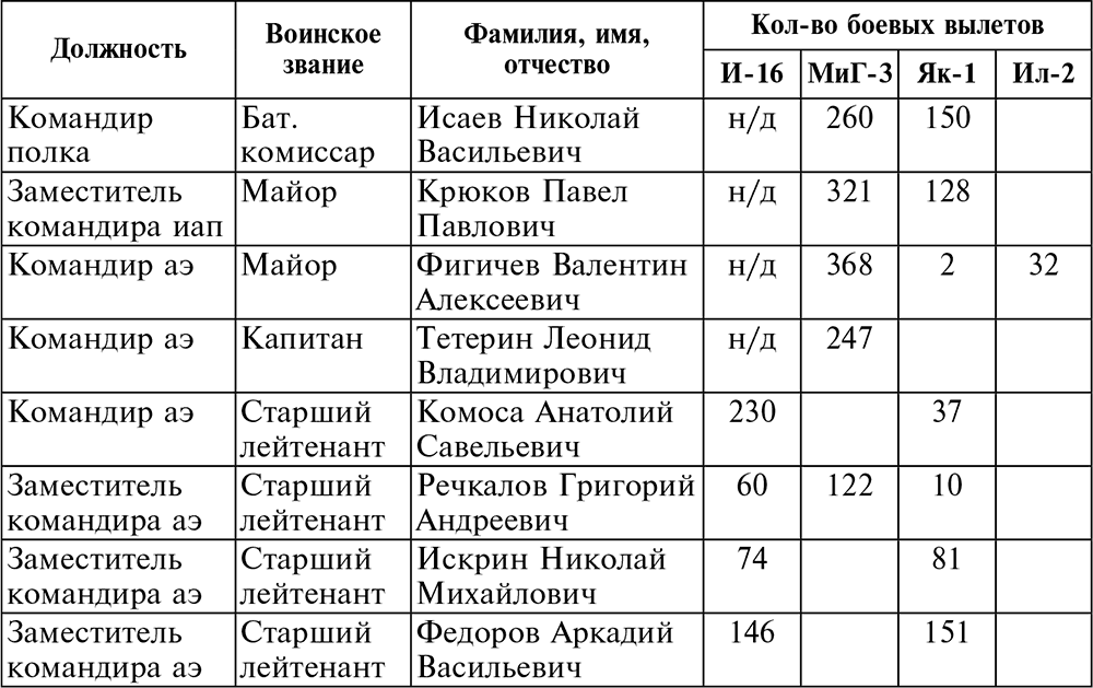 У остального летного состава 16-го гиап (8 пилотов), освоившего самолет МиГ-3, боевой налет составлял: гвардии майор Крюков – 321 б/в (343 часа), гвардии батальонный комиссар Исаев – 260 б/в (275 часов), гвардии капитан Тетерин – 247 б/в (267 часов), гвардии старший лейтенант Речкалов – 122 б/в (129 часов), гвардии старшина Голубев – 96 б/в (75 часов), гвардии лейтенант Труд – 136 б/в (131 час), гвардии капитан Покрышкин – 276 б/в (293 часа), гвардии старший лейтенант Паскеев – 225 б/в (224 часа 30 минут).